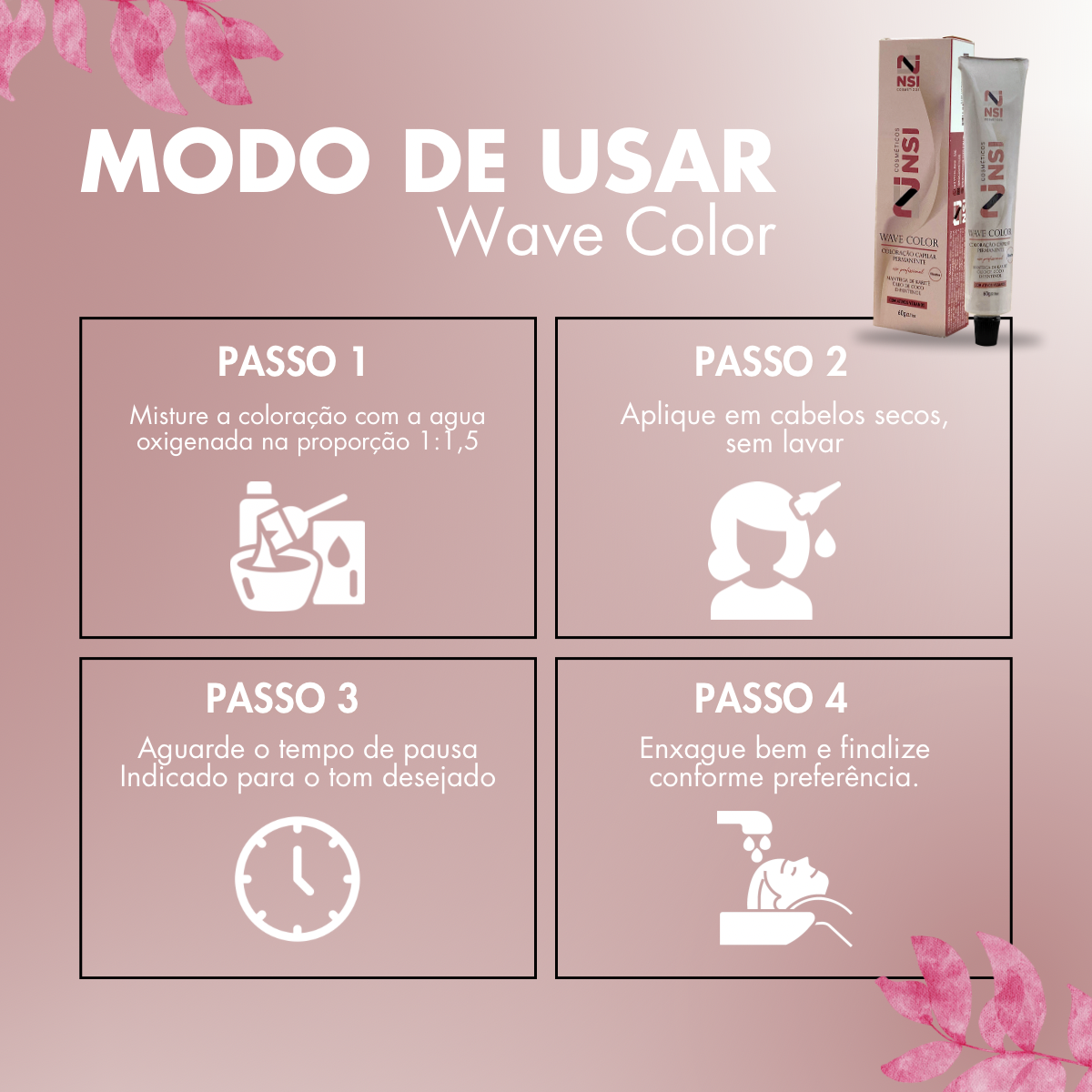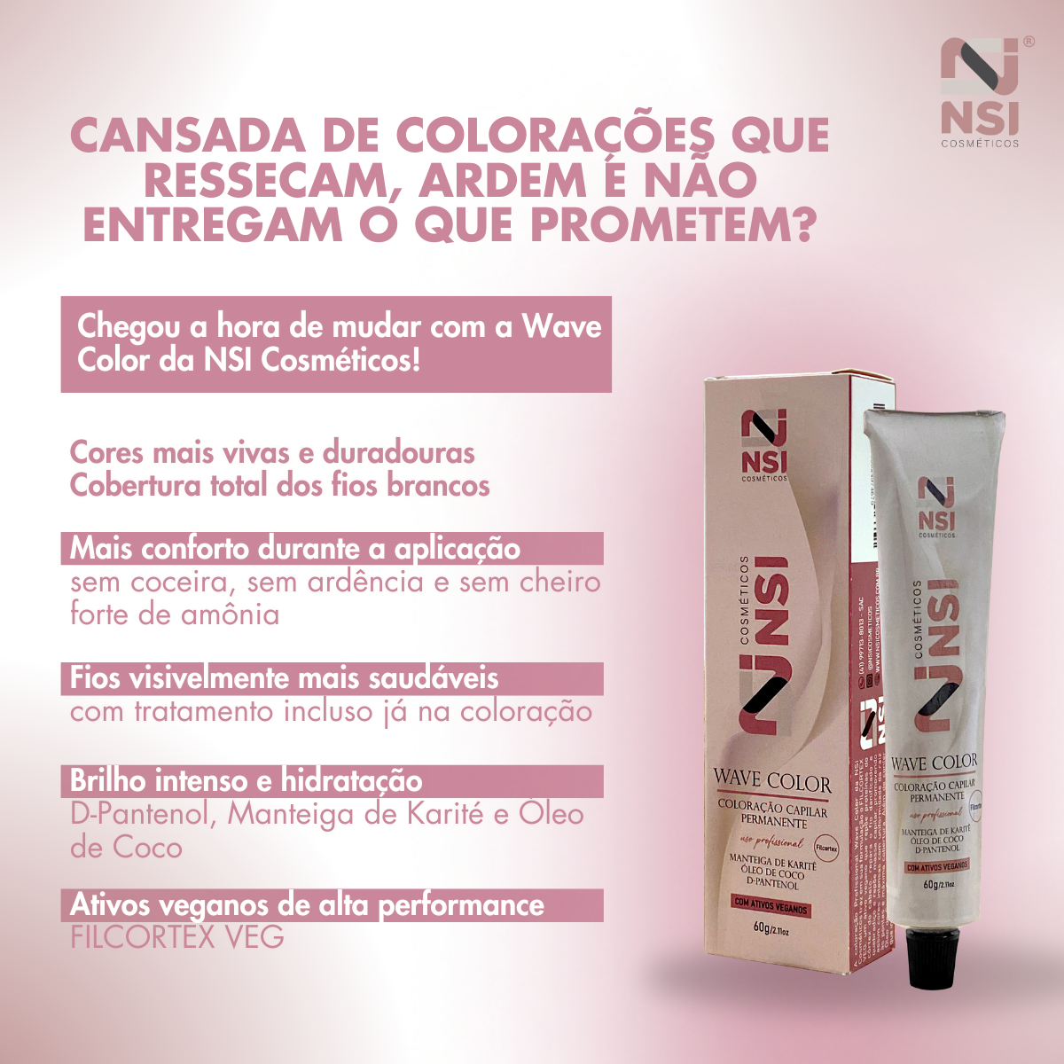 A Coloração Permanente Wave Color traz em sua formulação o FILCORTEX VEG, um ativo vegano que repõe proteínas do córtex do cabelo, repara o cabelo danificado e quebradiço e repõe massa capilar, promovendo assim cores intensas com uniformidade da raiz às pontas.