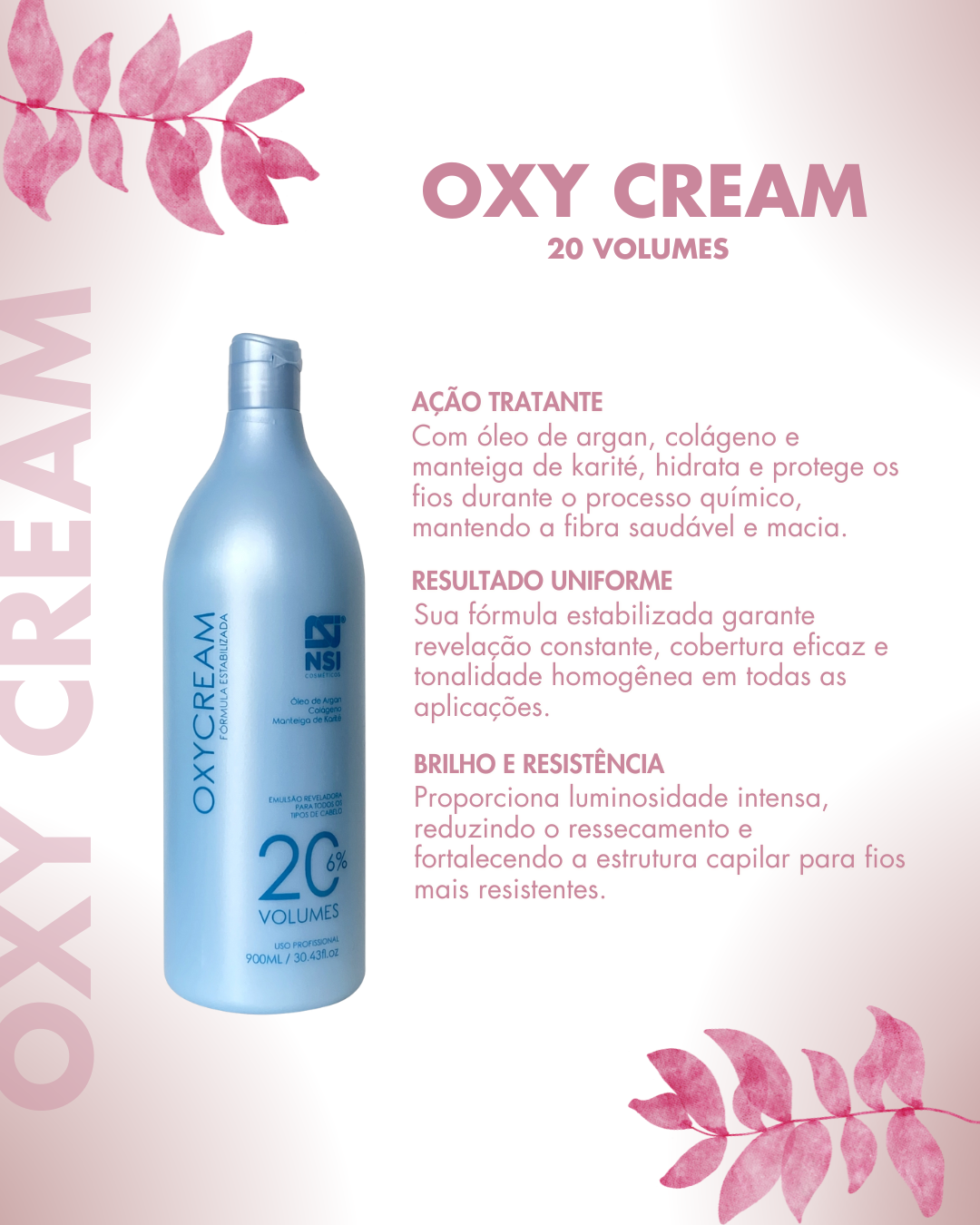 MODO DE USO: A Emulsão Reveladora Oxy Cream OX 20 vol. NSI deve ser utilizada em preparação de colorações e descolorações capilares na quantidade indicada no modo de preparo do produto a ser utilizado.